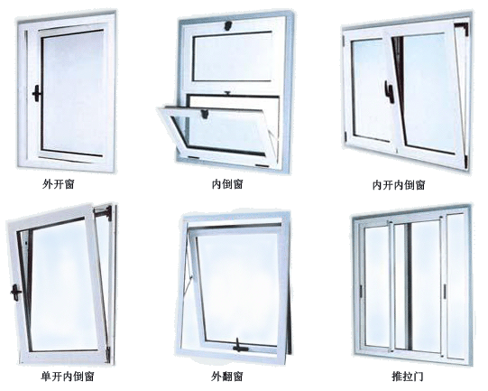 按開啟方式分為:固定窗、上懸窗、中懸窗、下懸窗、立轉(zhuǎn)窗、平開門窗、滑輪平開窗、滑輪窗、平開下懸門窗、推拉門窗、推拉平開窗、折疊門、地彈簧門、提升推拉門、推拉折疊門、內(nèi)倒側(cè)滑門。