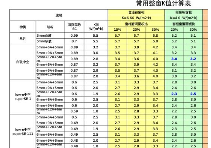 說到這里估計還會有朋友不太明白,簡單一點,我們就打個比方,斷橋鋁70系列的隔熱條普遍標準為2.48CM,其K值在2.05-2.8之間,除了隔熱條那就從占門窗面積最多的玻璃來降低K值,當(dāng)然想要斷橋鋁門窗K值更低更節(jié)能環(huán)保可以嘗試一下Low-e玻璃,下面給大家附上表格參考。